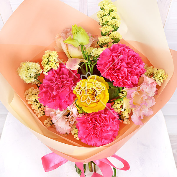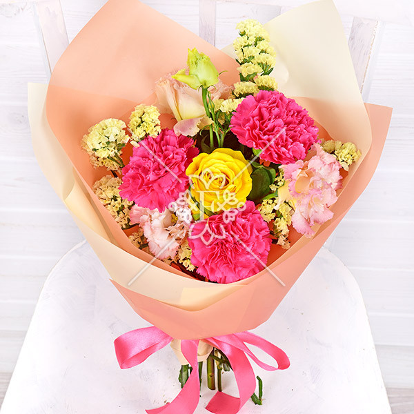 Гвоздика малиновая -3 шт., роза жестая – 1 шт.,эустома розовая -1 шт.,статица желтая – 1 шт., упаковка, лента.